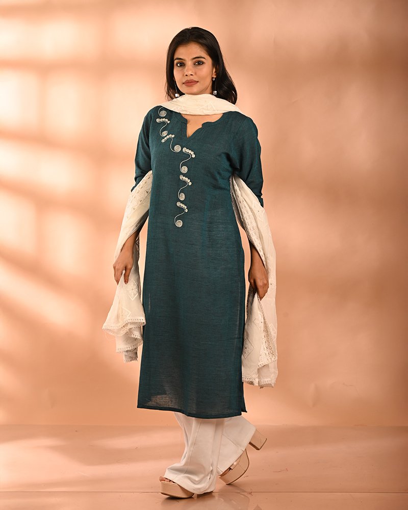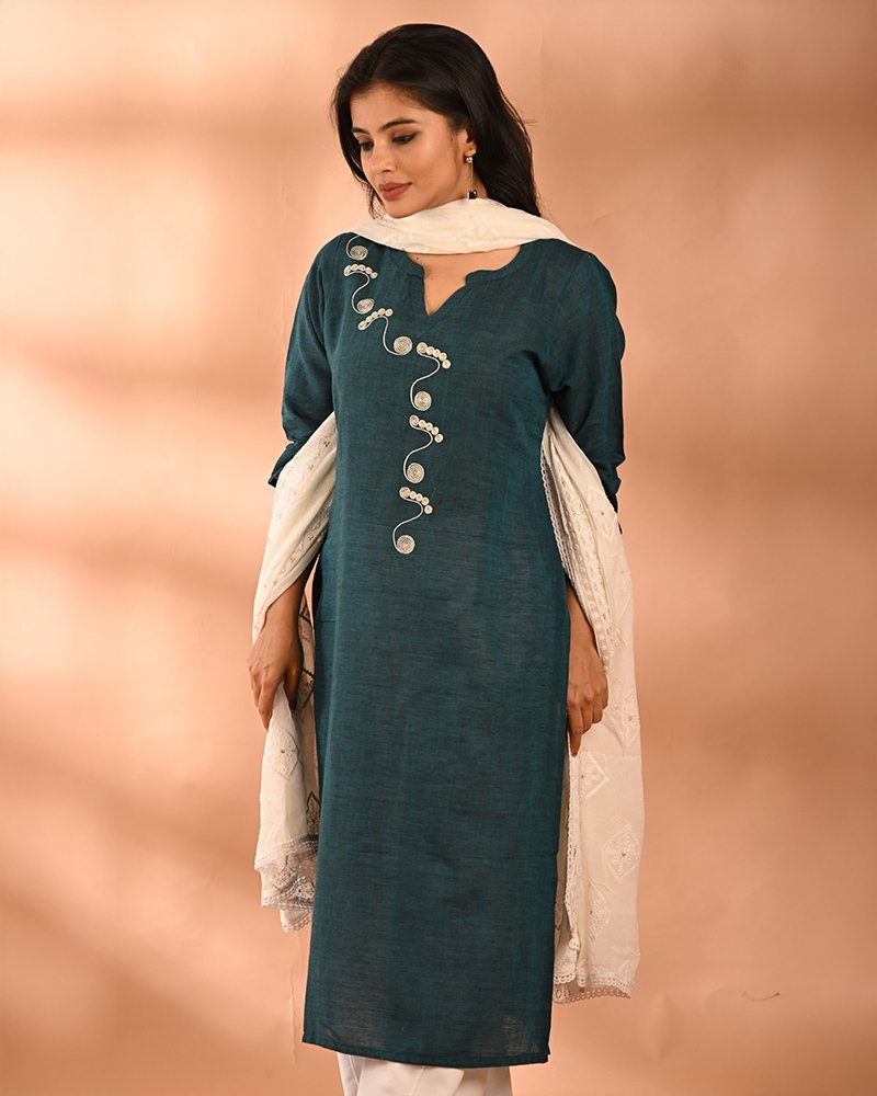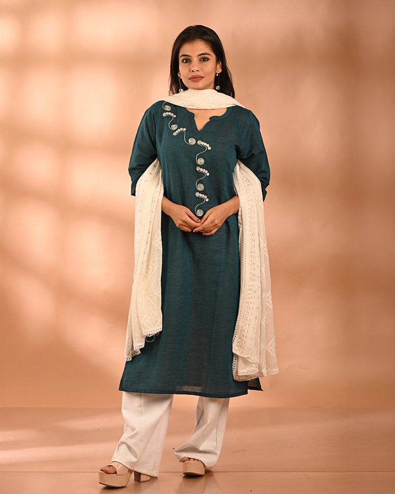 Material: Handwoven Pure Khadi Cotton Work Type: Hand aari embroidery Length: 46 inches Product Code: BTSCELK009